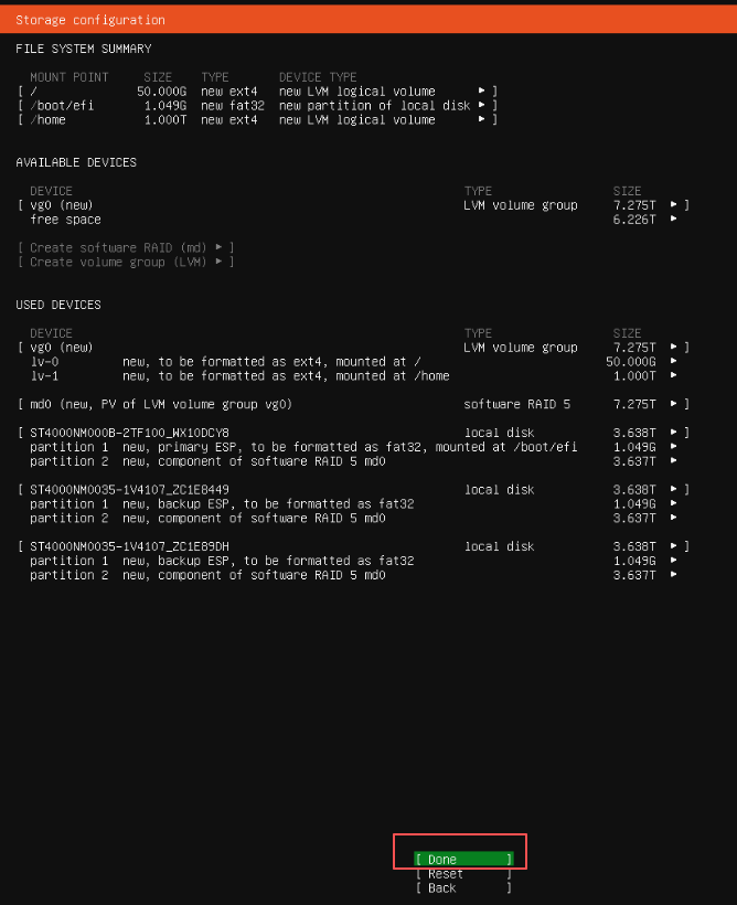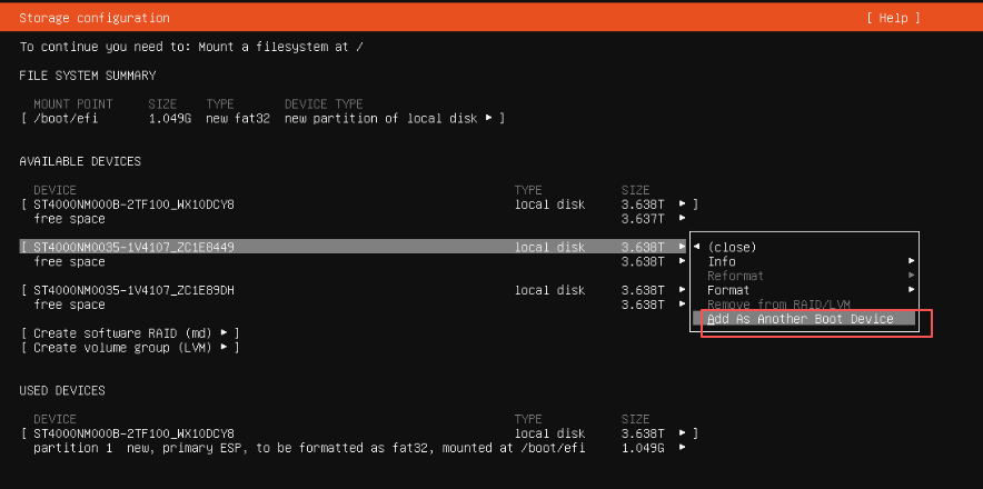 分别给3块硬盘创建efi分区,选为boot device就会自动创建