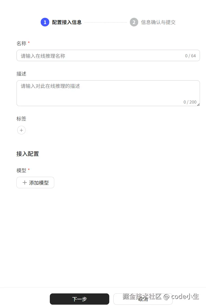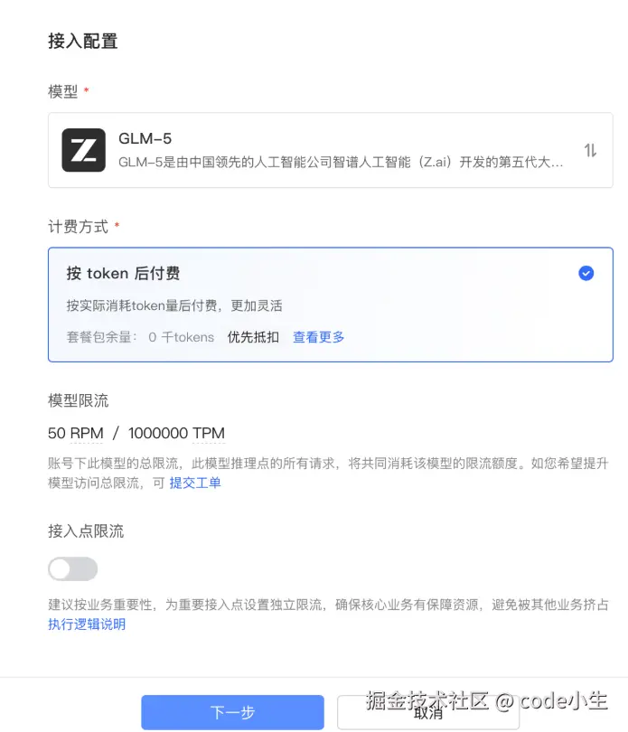 如果不需要调整模型限流(意思就是限制请求的频率),点击"下一步",确认一下,没有问题就点"提交"。