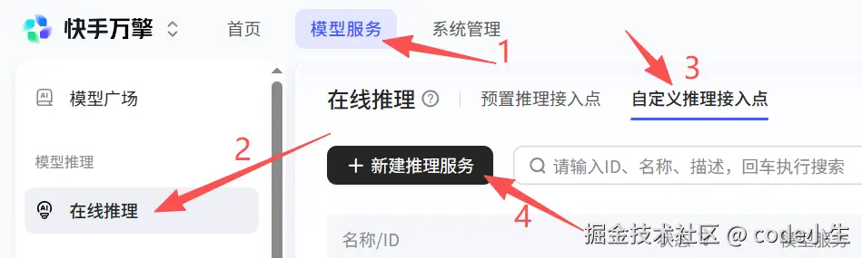 在"streamlake"界面中点击"模型服务" ,在左侧菜单中,选择"在线推理",在"自定义推理接入点"页签下选择"新建推理服务"