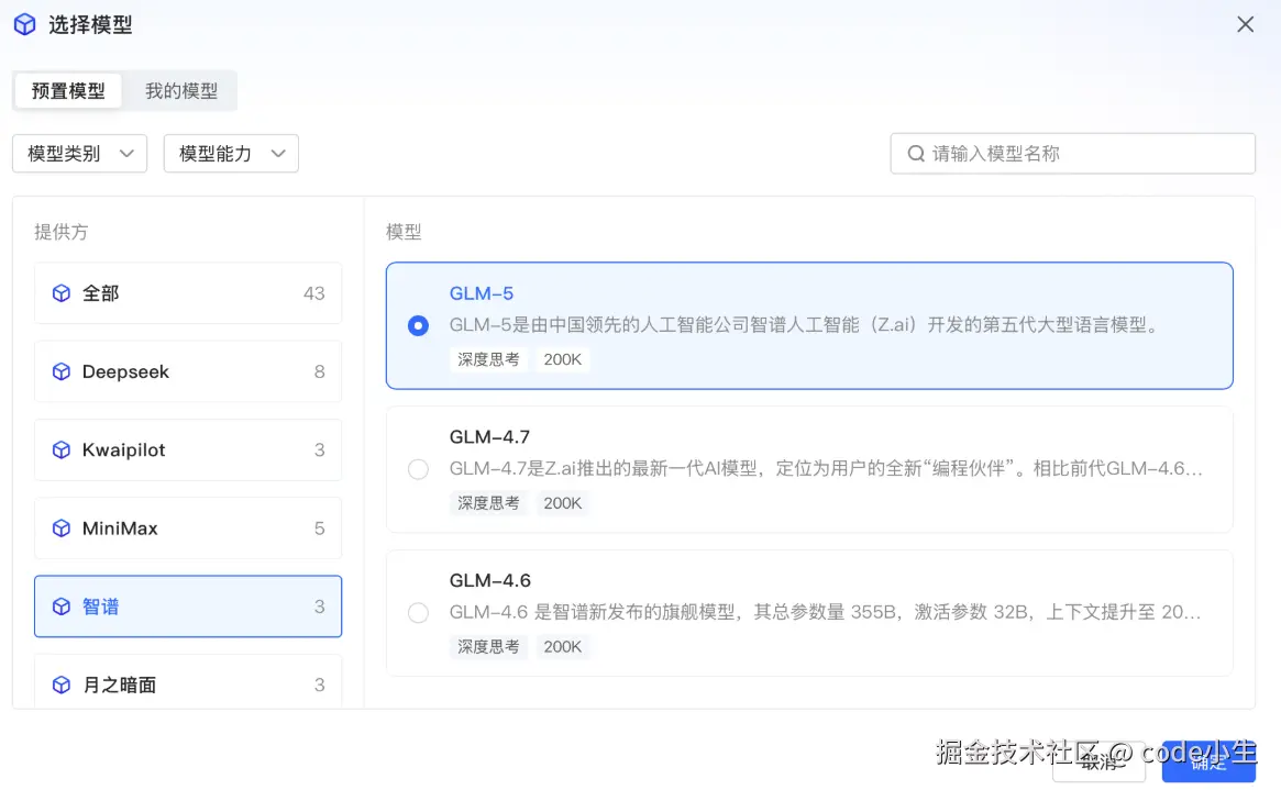 选择所需模型并点击"确定",可以按需选择不同的大模型,在此以GLM-5举例