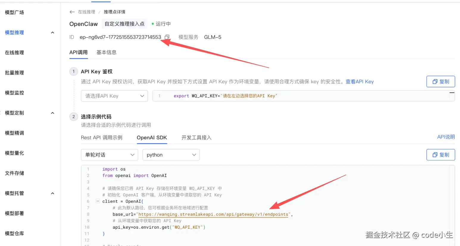 提交后就能立马看到 BaseUrl 和 Model ID,这两信息也是我们在 OpenClaw等类似工具里面调用所必须的,保存好。