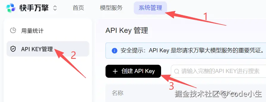 在"streamlake"顶部菜单中选择 系统管理-API KEY管理-创建 API Key,信息自定义就行,复制一下key保存好,别暴露,以后常用的话会一直用到。