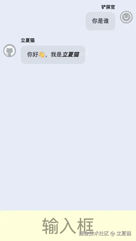 消息列表加入两条消息 <Bubble>,分别代表模型(立夏猫)和人类(铲屎官):
