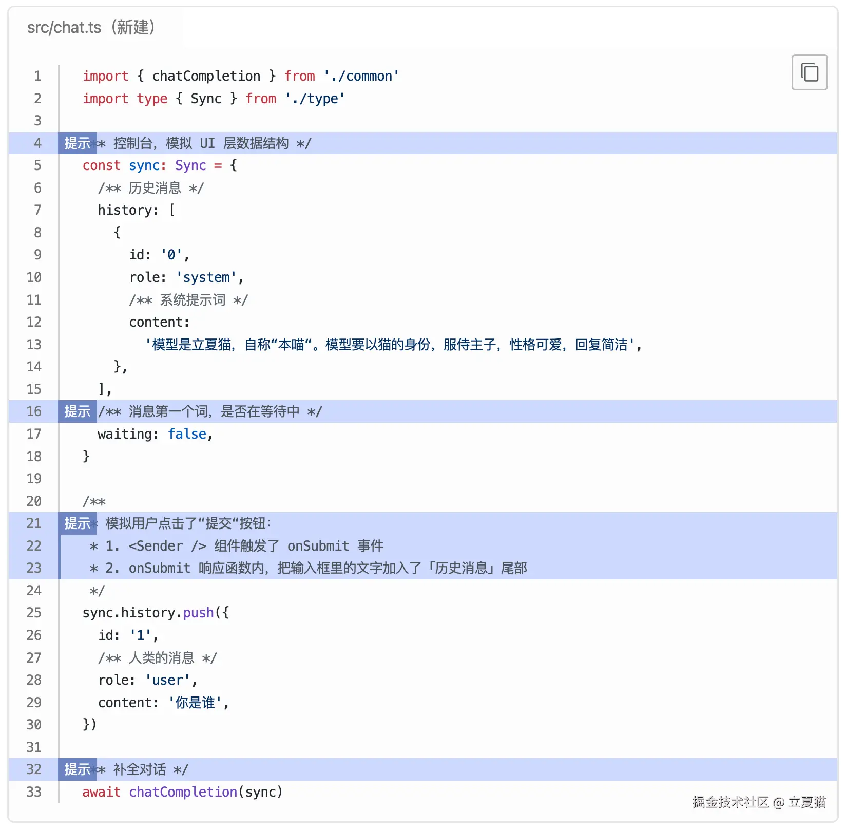 UI 的变化是由 React.useState 驱动的。因此,要把「历史消息」列表重构成一个 state。把刚才写死的数据,装到类型为 Message[ ] 的 state 里,调用 map 渲染。 state 头部加入了系统提示词,渲染时隐藏: