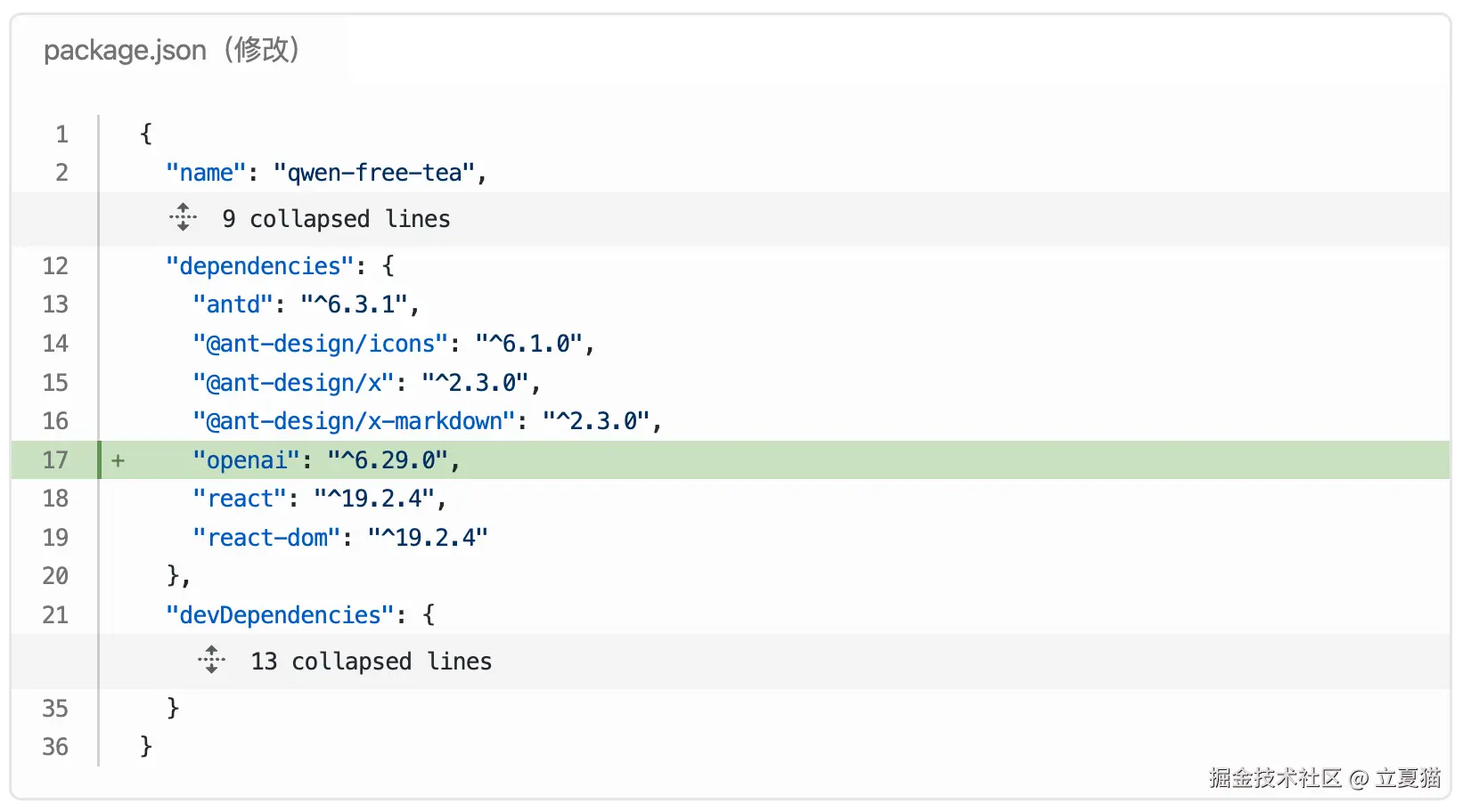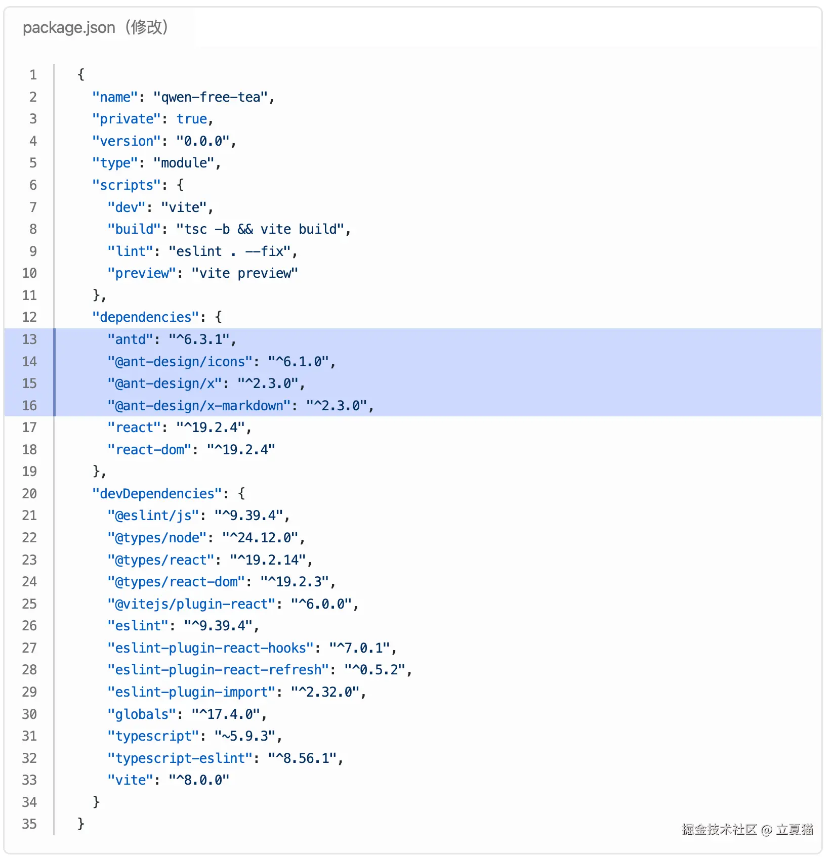 package.json 中,加入依赖项 antd、antd-icons、antd-x。 antd 是最常见的 B 端后台牛马,大家很熟了。antd-x 是同体系下,用于 AI 业务的组件。