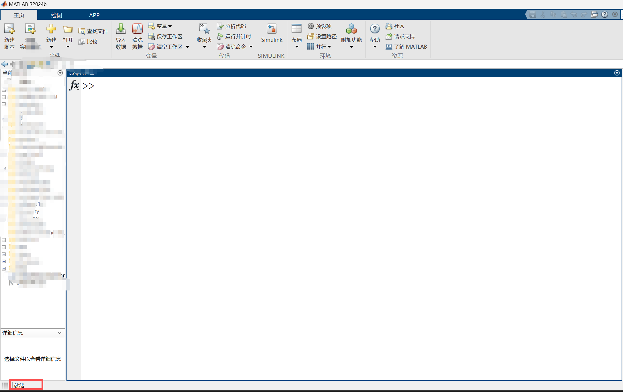 【注意】:如打开MATLAB工作环境之后,如果左下方出现了**【就绪】**,就说明MATLAB工作环境已经准备好了,大家可以开始编程了。