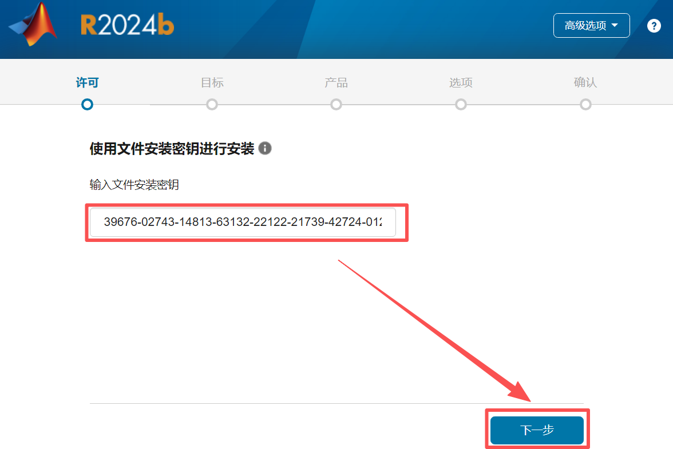 第二步: 在弹出的界面右上角点击**【高级选项】** ,选择**"我有文件安装密钥"**后,点"下一步"。