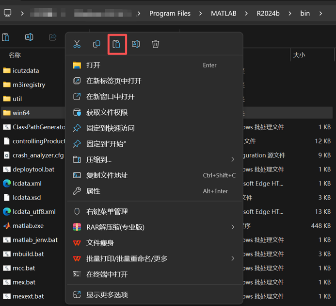 第十一步: 复制解压后的安装包文件,在Crack这个文件夹 下,将**【win64】文件夹 复制并粘贴到 通过MATLAB R2024b桌面快捷方式进入的MATLAB R2024b路径下** ,在弹出的【提示框】中选择【替换目标中的文件夹】。
