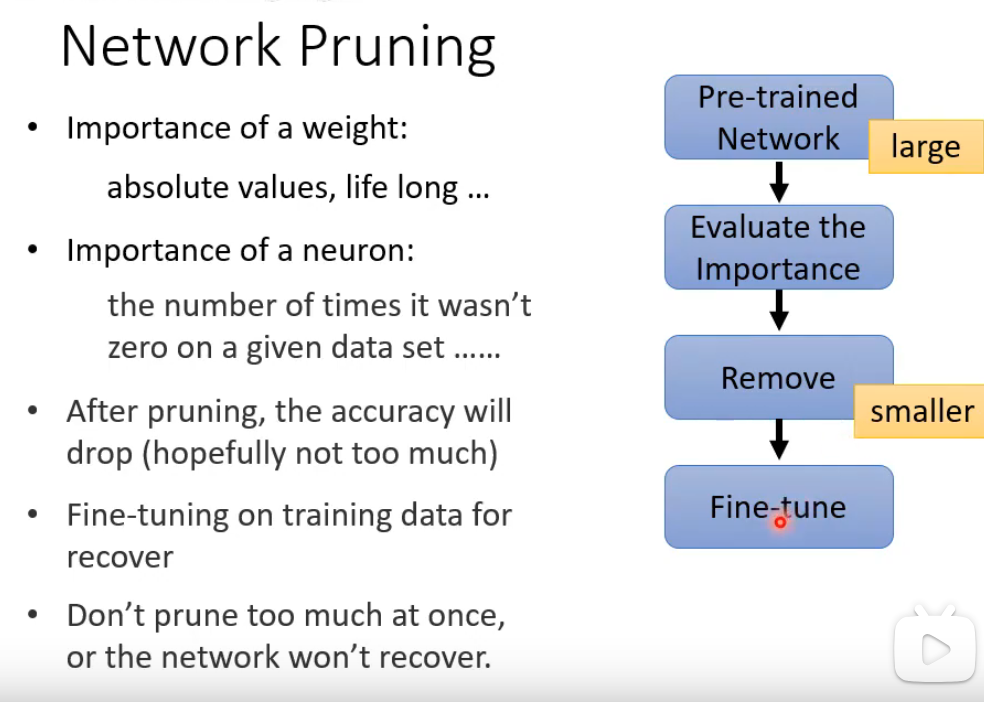 This week, I learned about the Network Pruning technique in Network Compression, understanding how to perform Network Pruning and why we choose to first train a large model and then prune it into a smaller model.