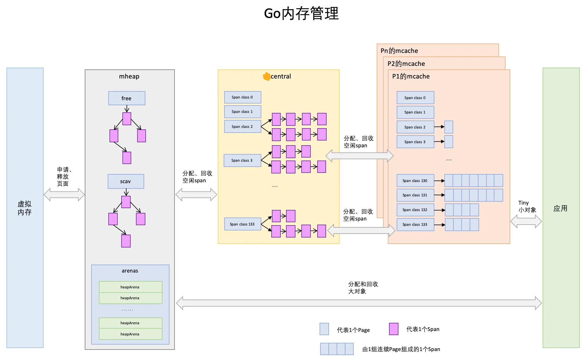 Go的内存管理借鉴了TCMalloc,Go内存管理的许多概念在TCMalloc中已经有了,含义是相同的,只是名字有一些变化。上图基于Go1.11,不同版本Go的内存管理有差异。