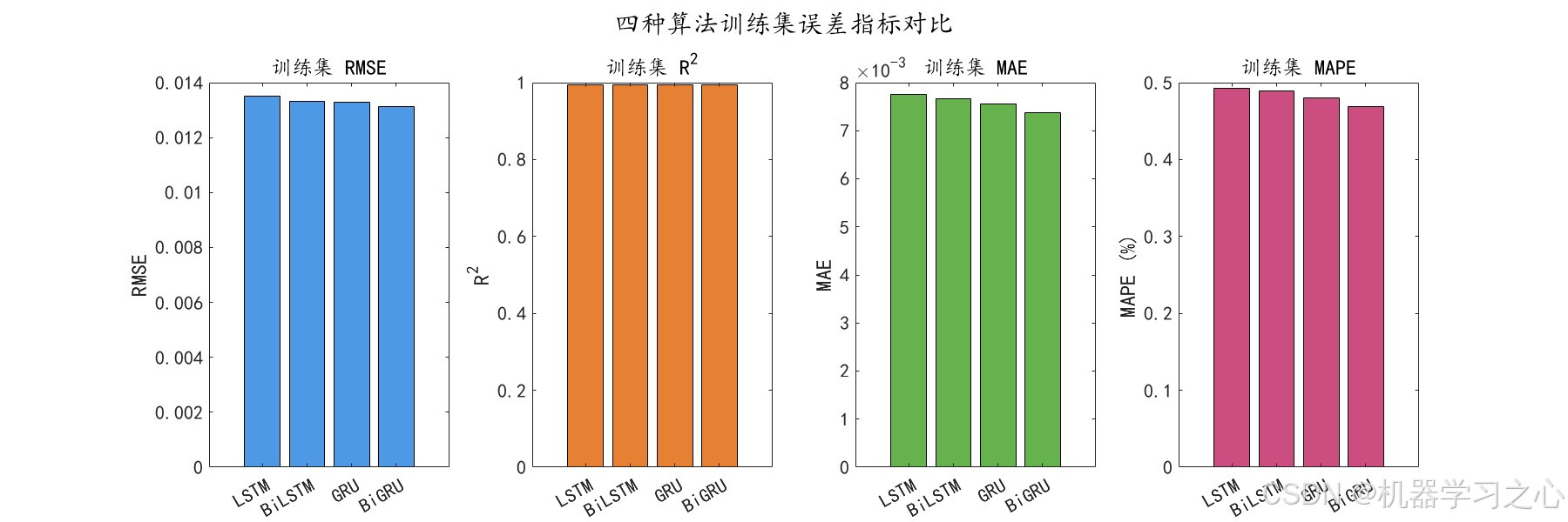 - 模型构建与训练:分别构建LSTM、BiLSTM、GRU、BiGRU网络,使用Adam优化器训练