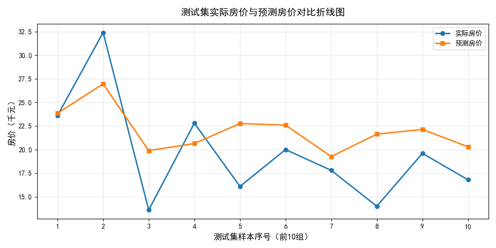 - 预测后对比前 10 组实际值与预测值,直观展示模型预测效果;
