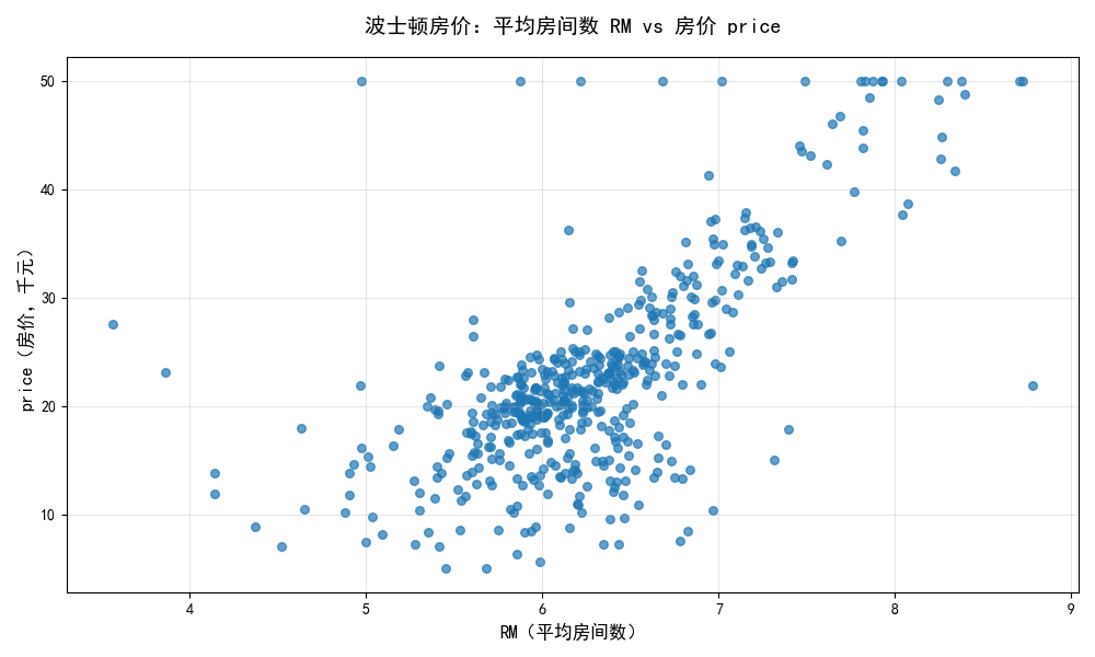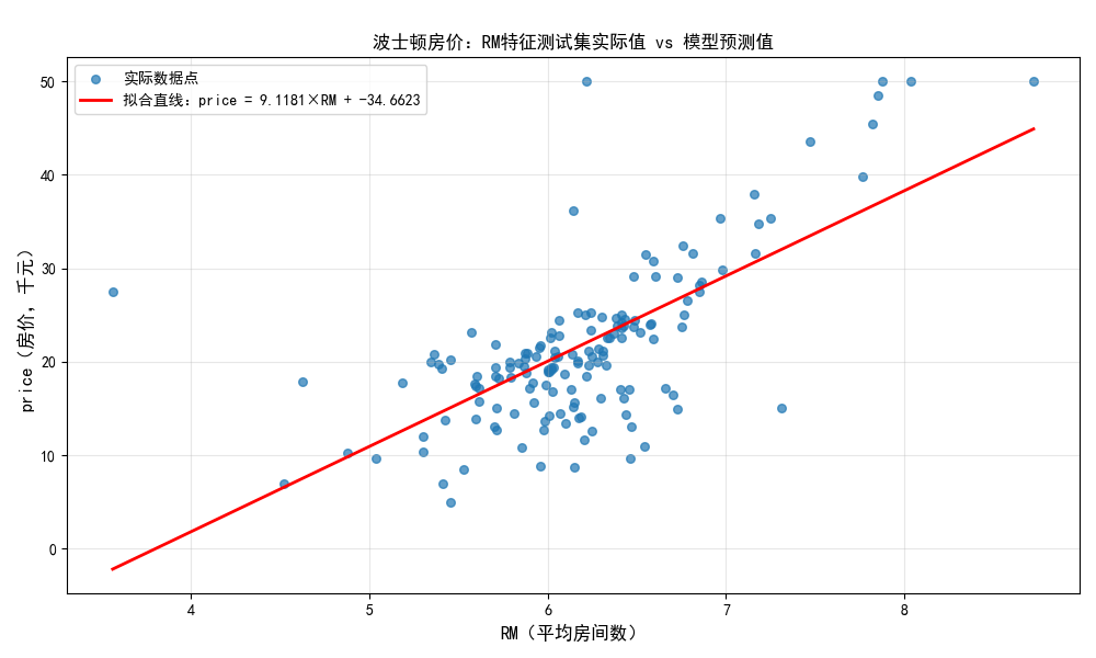 model.coef_[0]对应 RM 特征的权重 www,model.intercept_对应截距 bbb; - 直接输出拟合的回归方程,直观展示模型学习到的线性关系。