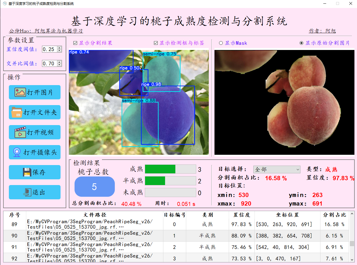 博主基于Pyqt5框架开发了此款桃子成熟度检测与分割系统,即文中第一部分的演示内容 ,能够很好的支持图片、视频及摄像头进行检测,同时支持检测结果的保存。
