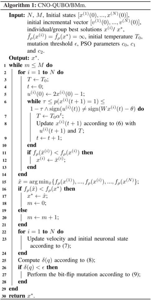 CNO-QUBO算法采用上下两层结构:下层由多个神经网络(如DHN、DHNm、BM、BMm)从不同初始状态出发进行并行搜索,获得局部最优解;上层在各网络收敛后,利用粒子群算法更新规则对状态进行重初始化,使搜索跳出局部最优并继续向更优区域推进。整体上通过神经网络的局部搜索与PSO的全局引导相结合实现优化过程,同时该框架可以替换不同神经网络形式,并可扩展到Ising模型。