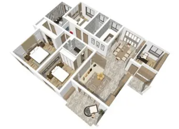 绘制墙体时,采用推拉工具统一设置层高(常规住宅2.8-3米),快速生成立体墙体;门窗、梁柱等结构单独绘制并成组,避免与墙体几何体粘连。建议提前设置图层,将墙体、地面、天花板、门窗分类管理,通过图层显隐快速切换视图,方便后续局部修改。建模完成后,删除多余线条、修复破面,保证模型干净整洁,为家具摆放扫清障碍。