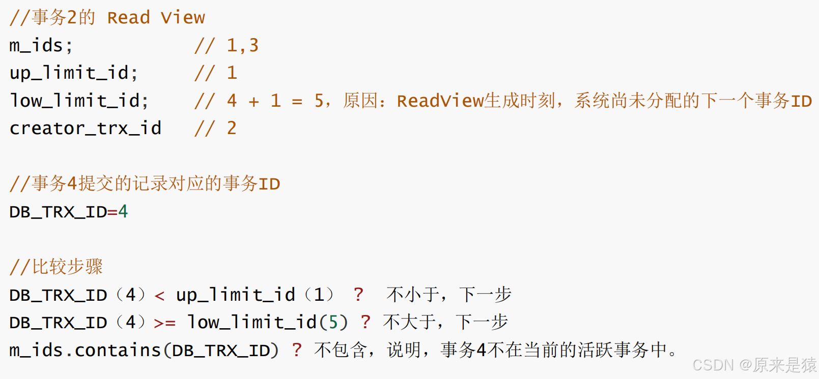 up_limit_id:当前系统中最小的活跃事务 IDlow_limit_id:当前系统中最大的事务 ID + 1(代表快照之后新事务的起点)m_ids:当前所有活跃(未提交)事务 ID 的集合