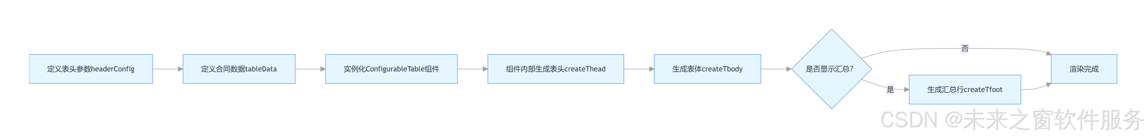 - 核心逻辑:定义表头规则 + 准备合同数据→实例化组件→自动渲染表格(含可选汇总);