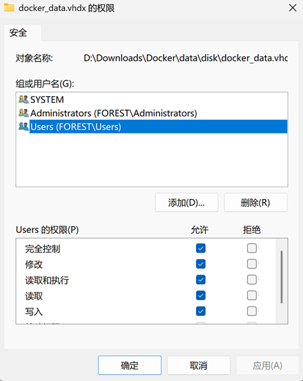 D:\Downloads\Docker\data\disk,右键docker_data.vhdx,属性-安全-编辑