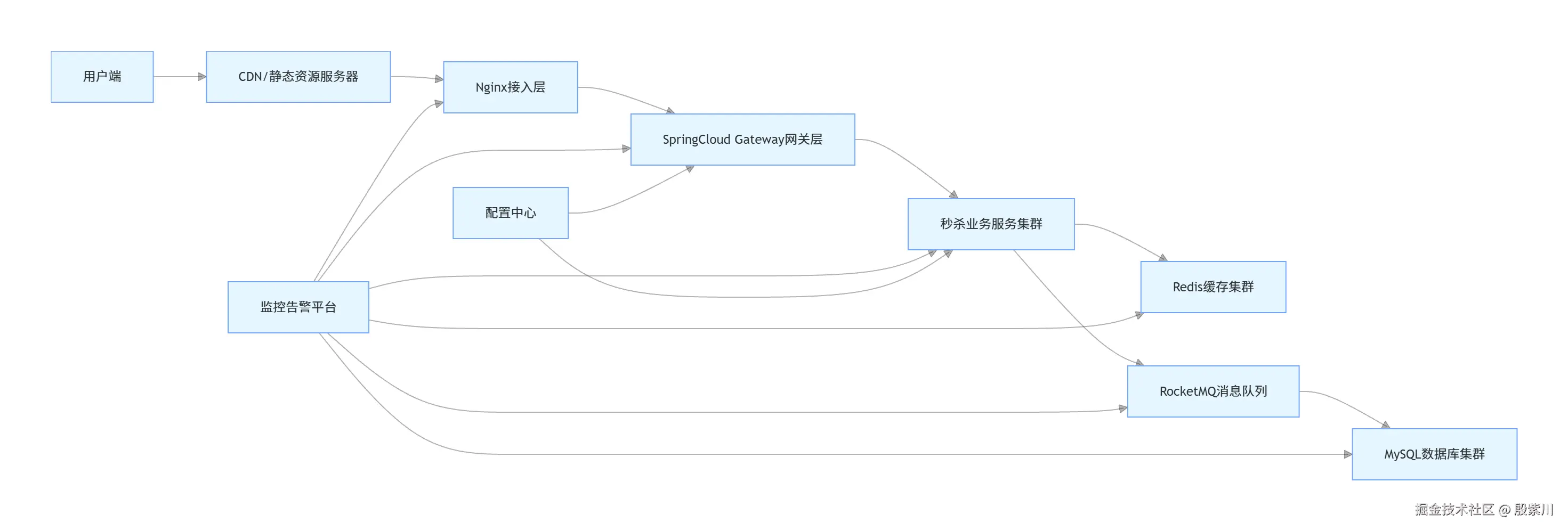 - 瞬时流量洪峰:秒杀开启瞬间,QPS可能从日常几百飙升至数十万甚至百万级,常规架构会被直接打穿