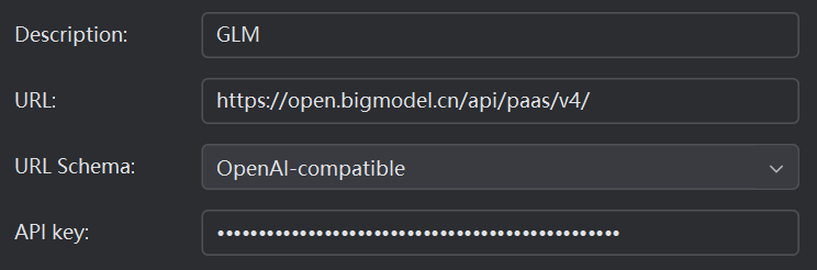 - URL Schema :这是接口协议的规范类型。当前选的是 OpenAI - compatible,意思是:这个第三方模型服务的接口格式,和 OpenAI 的 API 格式兼容。