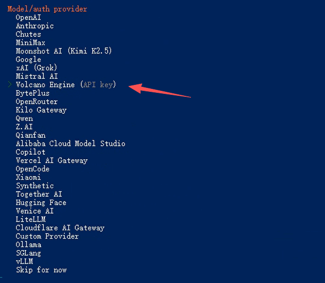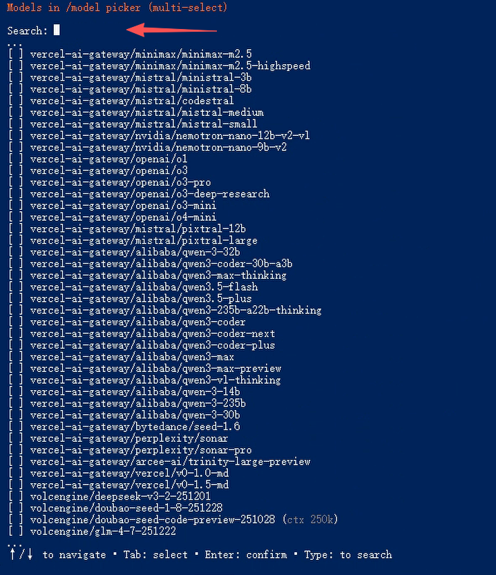 默认出来很多,我们直接输入 doubao 就自动搜索出来了;volcengine/doubao-seed-1-8-251228(豆包通用大模型,适合日常聊天、问答)我们可以按tab+空格+方向键