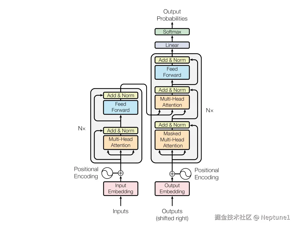 市面上基本所有大模型都是基于Transfer(如下图所示) 这套架构训练出来的,这就是大模型的底层引擎