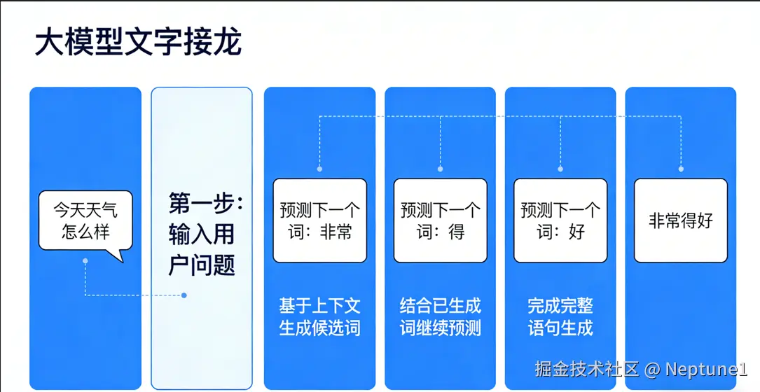 1. 文字接龙本质:大模型本质是文字接龙游戏,接收问题后预测下一个概率最高的词,将其追加到输入继续预测,直至输出结束标识符。