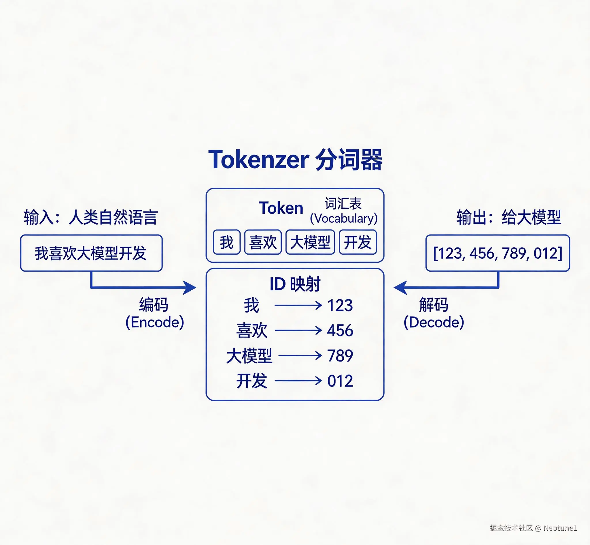 由于大模型本质就是一个数学函数+矩阵运算,他只认数字,不认文字、标点等。所以你如果输入给大模型一串文字和标点,那么他就无法读懂你的意思。而Tokenizer就是大模型中连接人类语言和模型数字运算的核心翻译官,负责把人类文字编码成大模型能运算的数字序列,再把大模型输出的数字转换为人类能读的文字,可以说,没有Tokenizer,大模型就是文盲