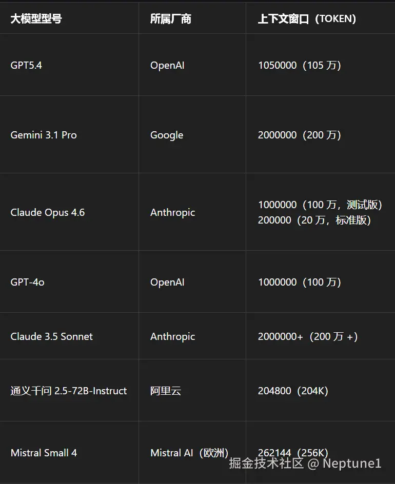 Context Window(上下文窗口),Content Window直接决定了Context能有多大,下图是目前主流大模型的Context Window的大小,100万Token的大小大约可以放下150万的汉字数量。