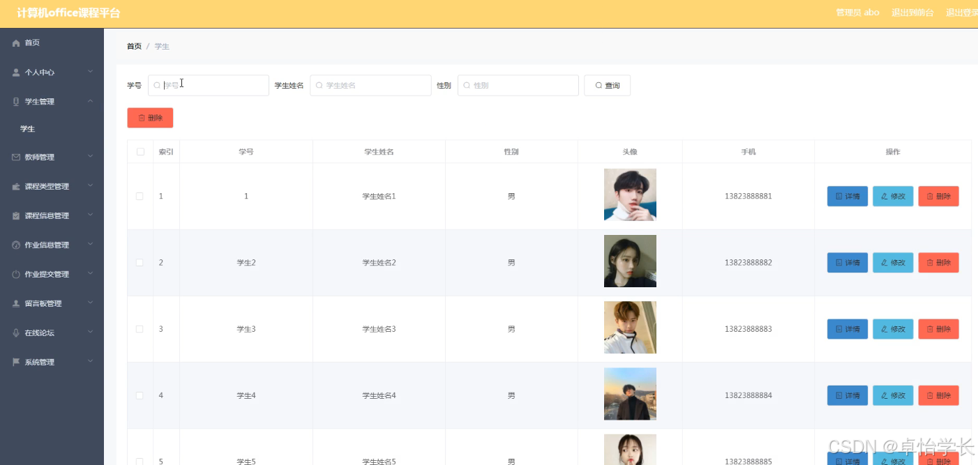 管理员管理学生信息,可以添加,修改,删除学生信息信息。下图就是学生信息管理页面。