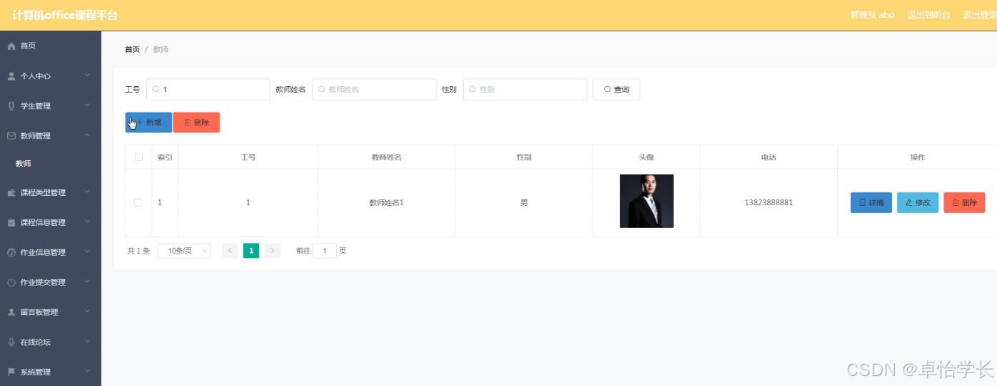 管理员管理教师信息,可以添加,修改,删除教师信息信息。下图就是教师信息管理页面。