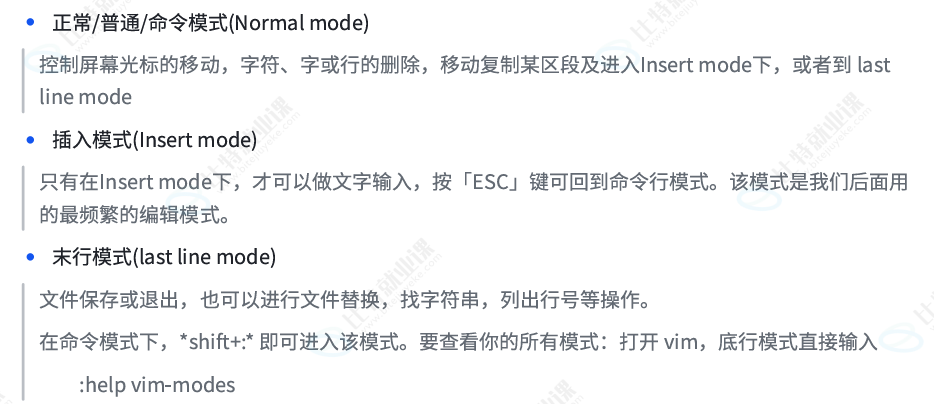 我们先主要学习vim的三种模式(其实有好多模式,⽬前掌握这3种即可),分别是命令模(command mode)、插⼊模式(Insertmode)和底⾏模式(lastlinemode),各模式的功能区分如下: