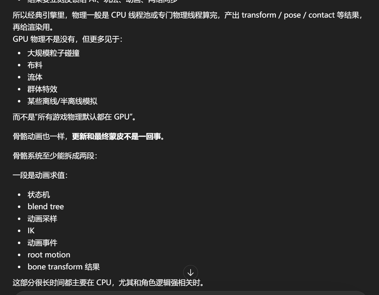 如果让主线程将渲染指令提交到队列继续下一帧的更新,会让帧率变得更平滑,因此我们可以采用延时一帧的等待策略,将图形API的调用直接封装成渲染指令,提到到渲染队列有返回值的图形API,在主线程将渲染指令提交到队列时,应该返回什么值?带宽代表的是有多少事情可以同时做性能(处理速度)说的是一件在逻辑上必须按顺序处理的事情本身可以多快完成。软件多线程不足: 如果你的软件(如老旧游戏或单线程程序)只写了"做一项任务",那么系统只能让一个 CPU 核心负责它。其他核心即使加了,也只会显示 0% 使用率。
