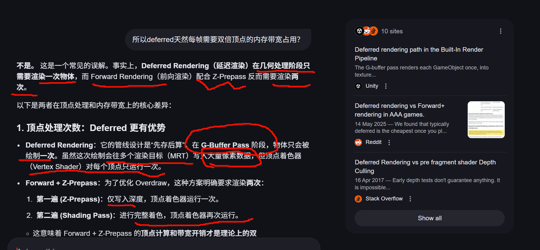 - Forward 的带宽瓶颈:主要集中在纹理采样和光照计算。如果不加 Z-Prepass,严重的 Overdraw 会导致大量的无效像素着色计算。