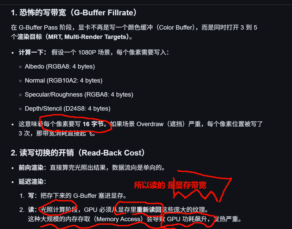 - Deferred 的带宽瓶颈 :由于需要同时向多个纹理(Albedo, Normal, Depth, Roughness 等)写入数据,G-Buffer Pass 阶段对 像素填充速率(Fillrate)和显存带宽 的压力极大。