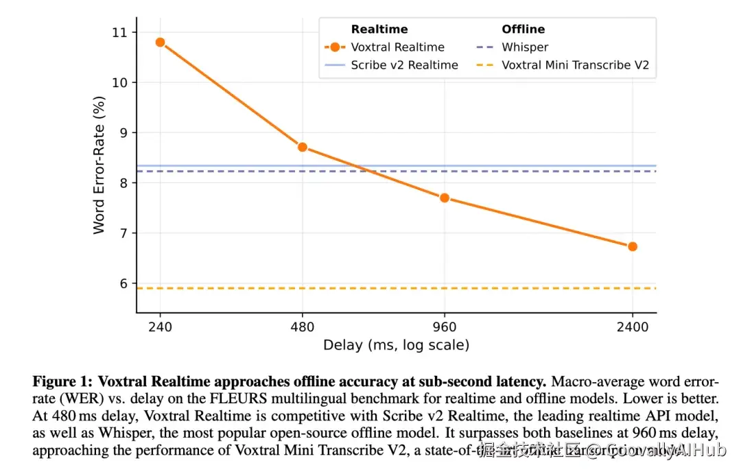与离线模型的关系:Voxtral Realtime 不是要替代 Whisper 或 GPT-4o Transcribe 等离线模型,而是填补"需要实时输出"的场景空白。在 480ms 延迟下,它的精度与离线 Whisper 的差距控制在 1% WER 以内(长音频场景甚至更优),这是此前流式模型难以达到的水平。