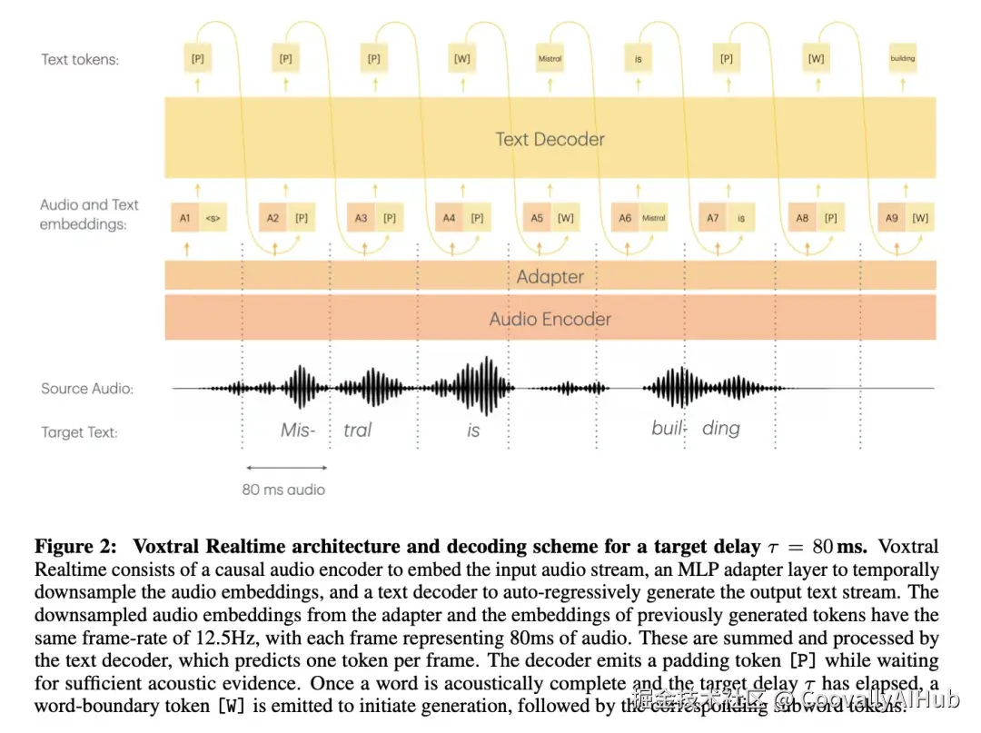 Voxtral Realtime 走了另一条路:从训练阶段就按流式设计。它的编码器使用因果注意力(causal attention),只关注当前和过去的音频帧,不依赖未来信息;文本解码与音频输入之间有明确的时间对齐关系------每个文本 token 对应 80ms 的音频。这种"原生流式"设计避免了分块方案的边界割裂问题,同时支持配置不同的延迟(从 80ms 到 2400ms),在精度和延迟之间灵活取舍。