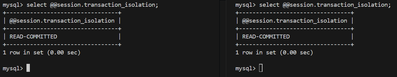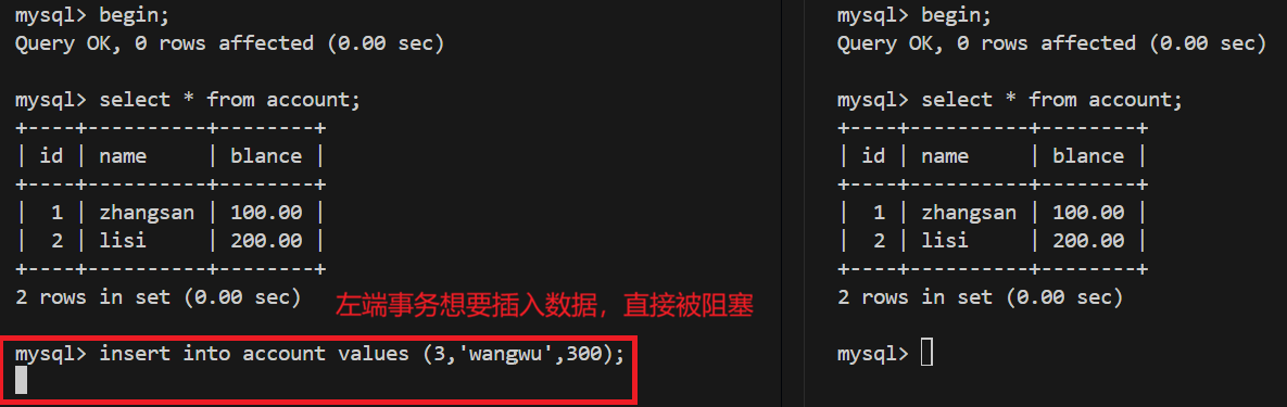 两个终端都启动事务,左端事务添加的数据在commit提交之前,右端事务看不到数据