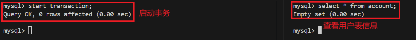 我们启动两个终端(两个客户端),一个执行事务操作,一个查看用户表信息,左边使用 begin 或 start transaction启动一个事务: