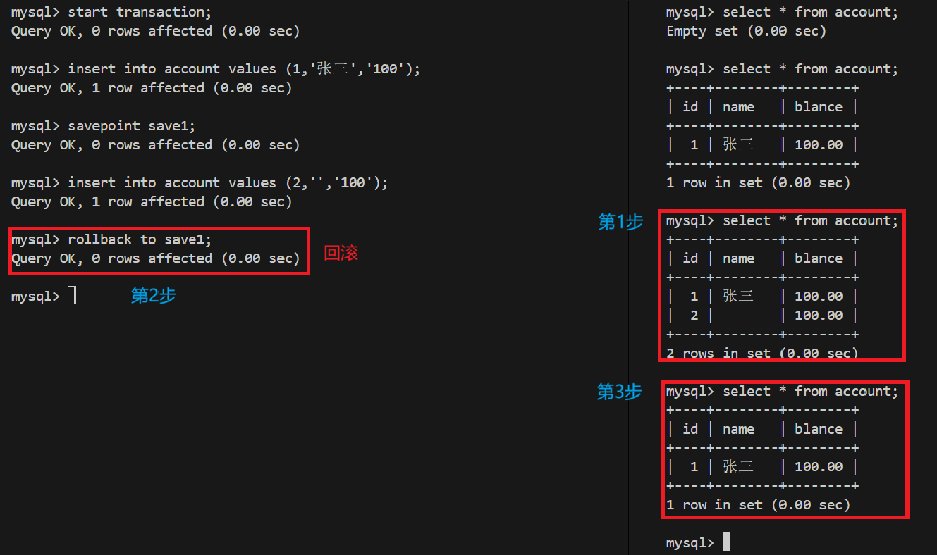 - rollback to 保存点命令,可以让事务回滚到指定保存点。
