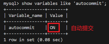 autocommit为ON,则单条SQL语句执行后会自动被提交,如果为OFF,则SQL语句执行后需要使用commit进行手动提交: