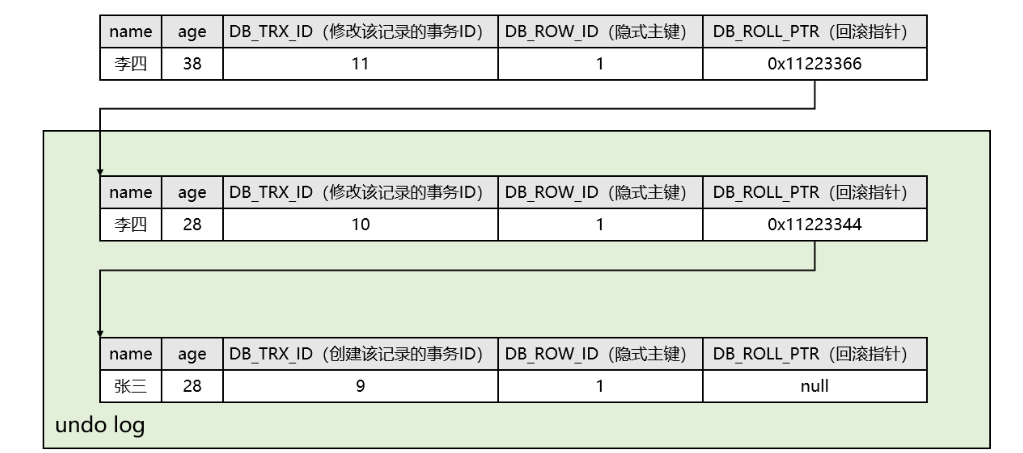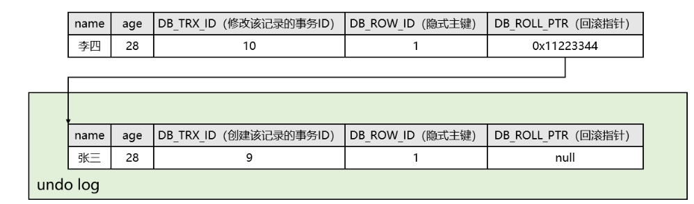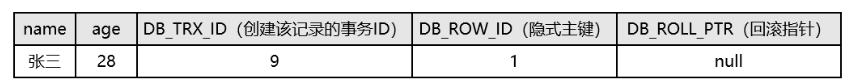 | name | age | DB_TRX_ID(创建该记录的事 务ID) | DB_ROW_ID(隐式 主键) | DB_ROLL_PTR(回滚 指针) |