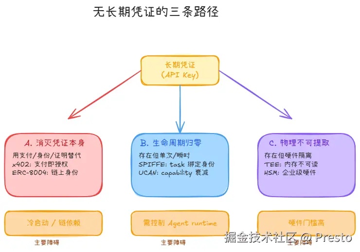 这是"消灭凭证本身"最彻底的实现。但冷启动问题几乎致命------API 厂商没有动机改造计费体系,开发者侧也强依赖 Base L2 + USDC。