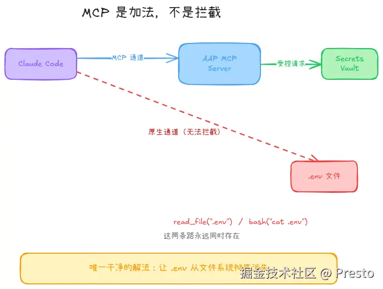 你加了 get_secret,但 read_file(".env") 仍然存在。两个通道同时有效,Claude Code 可以绕过你的 MCP 直接读文件。