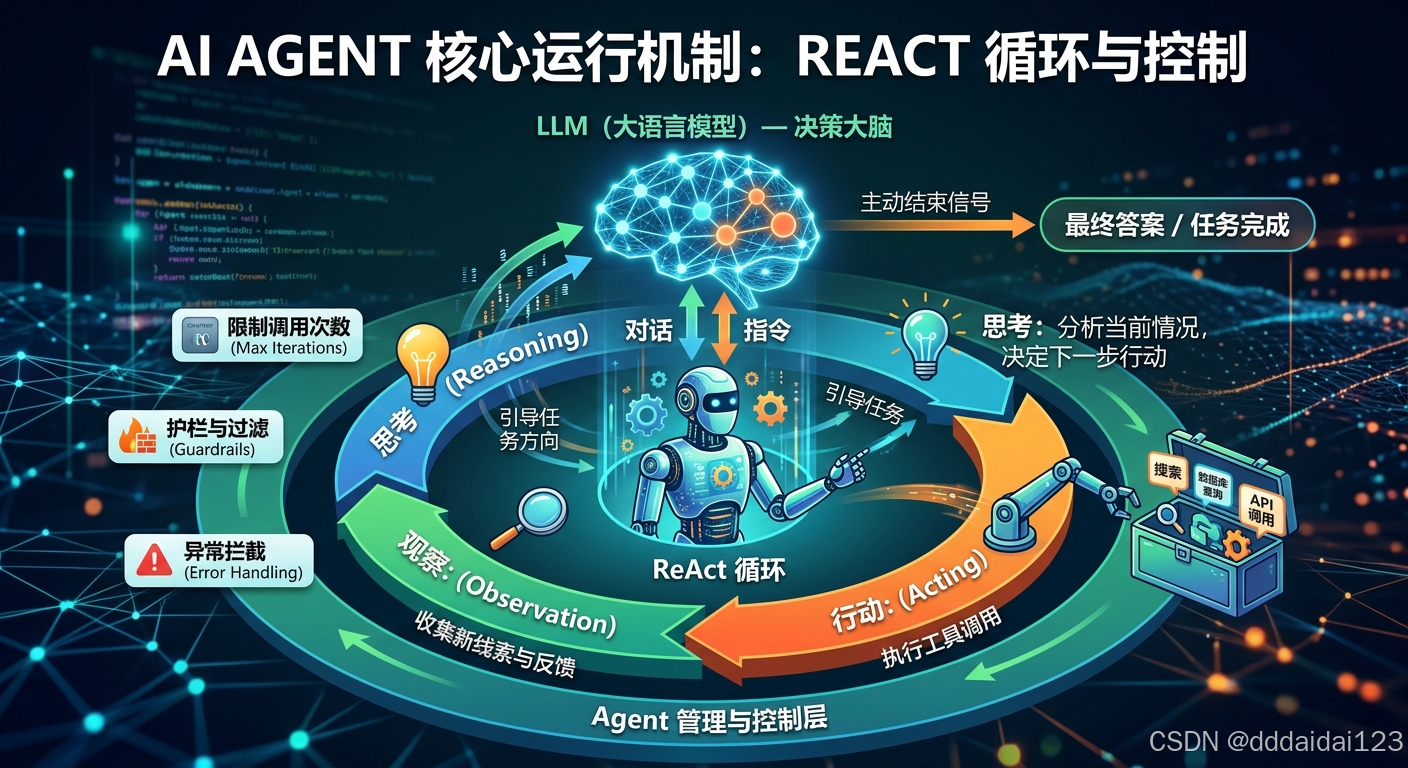 agent是一个无限循环,在这个循环中,agent不断和llm对话,并引导llm执行任务,此外还能响应llm的工具调用等功能,最后由llm主动结束循环(agent会限制llm的调用次数、护轨、拦截等等)