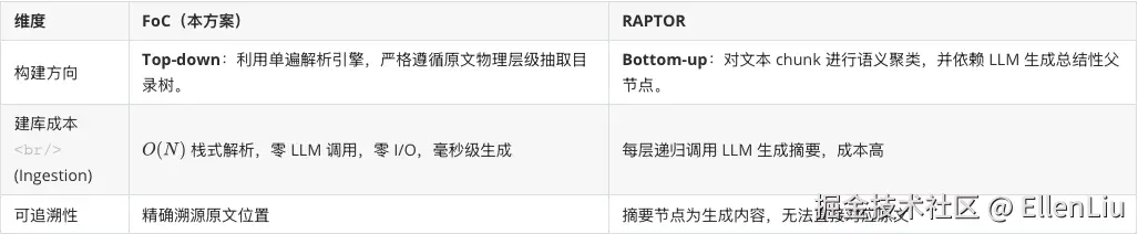 RAPTOR 的出现,从学术界侧面印证了"为文档建树(Tree-Organized)"是解决长文本 RAG 召回盲区的绝对正确方向。技术选型必须敬畏业务场景,FoC 吸收了 RAPTOR 的树状检索视野,通过确定性解析,去除了在合规场景下的缺陷,实现了学术前沿与金融级工程落地的融合。