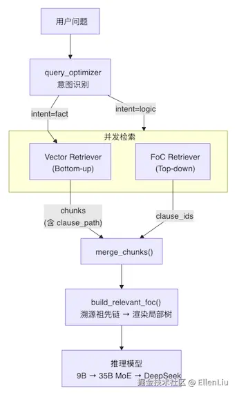 架构破局 :设计了 FoC (Forest of Clauses) 条款森林 架构,将文档目录树提升为"一等公民"。采用 Top-down(LLM 树结构路由)与 Bottom-up(向量碎片检索)双引擎并发,在内存中完成"局部树"的精准拼装。