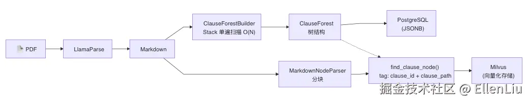 架构意义 :有了 clause_path,任何一个在向量库里捞出来的孤立碎片,都能瞬间溯源找到它的"完整血脉"(祖先节点链),实现了从无序碎片到有序结构的反向映射。