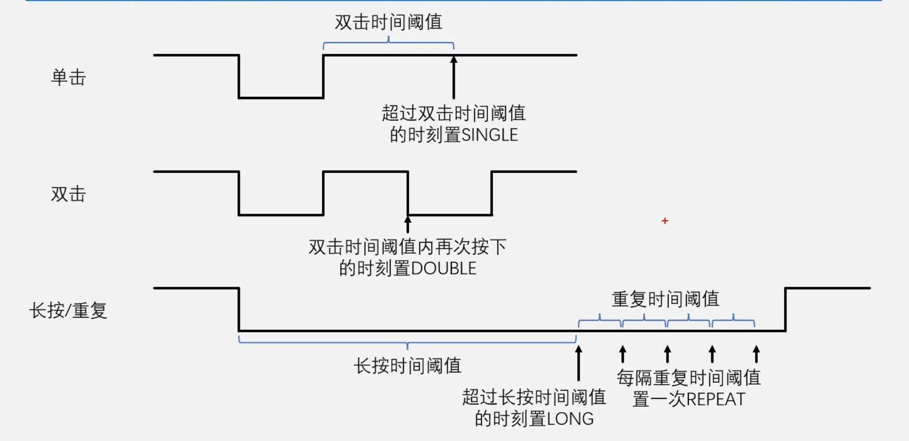 单击:当按键到我们规定的(长按时间阈值)时间之前松开按键时,我们继续计时(双击时间阈值),当按键到我们规定的(双击时间阈值)时间都没有按下时,这时我们判断按键为单击 ,当按键到我们规定的(双击时间阈值)时间按下时我们判断按键为双击,